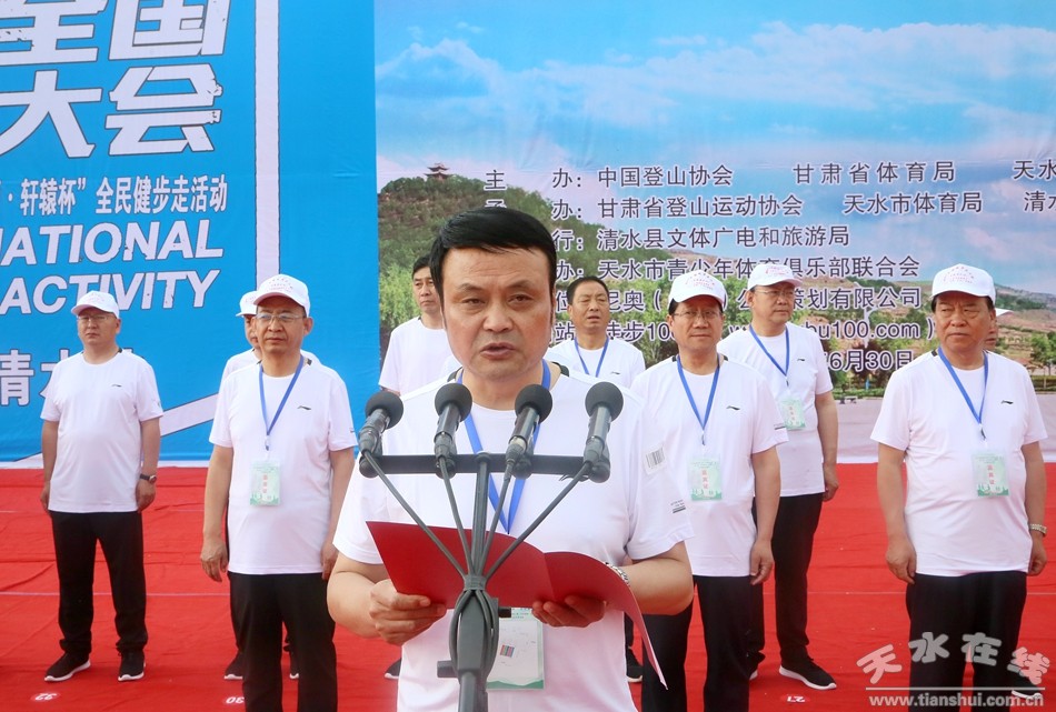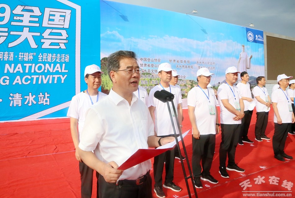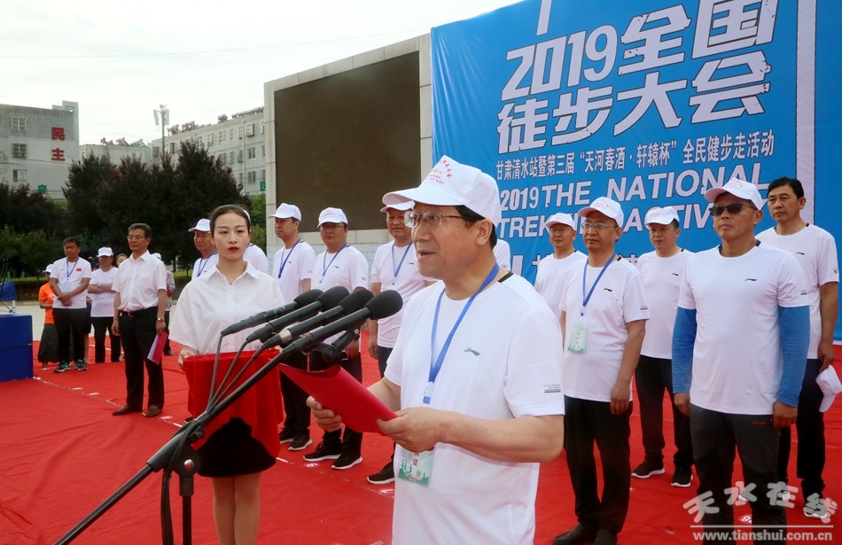 (天水市人大常委會副主任蒲朝暉宣布2019年全國徒步大會甘肅清水站暨第三屆“天河春酒+軒轅杯”全民健步走活動啟動。)