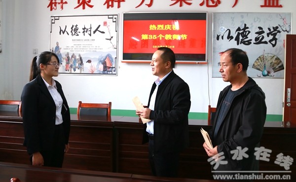 全國(guó)第35個(gè)教師節(jié)之際,9月10日上午,清水縣委常委、組織部長(zhǎng)張鋮,縣人大常委會(huì)副主任畢德祥,縣政府副縣長(zhǎng)安偉,縣政協(xié)副主席曹鳳娥先后來到清水縣一中、原泉小學(xué)、紅堡中學(xué)、黃門中心小學(xué)等學(xué)校,走訪慰問優(yōu)秀教師、困難教師代表,向辛勤耕耘在教育戰(zhàn)線上的廣大教師和教育工作者致以節(jié)日祝賀和誠(chéng)摯問候。
