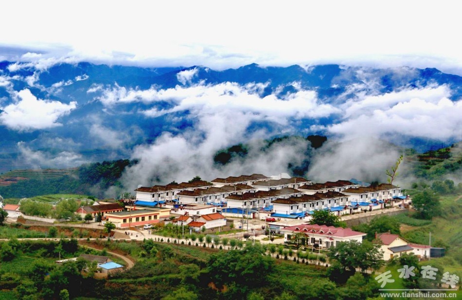 從清水縣城一路向東,沿著盤旋的山路,慢慢走進(jìn)了海拔1800多米的“云端”,云海深處,一處整齊劃一的嶄新村落隱沒其間,如夢(mèng)似幻、如詩似畫,宛若置于人間仙境。