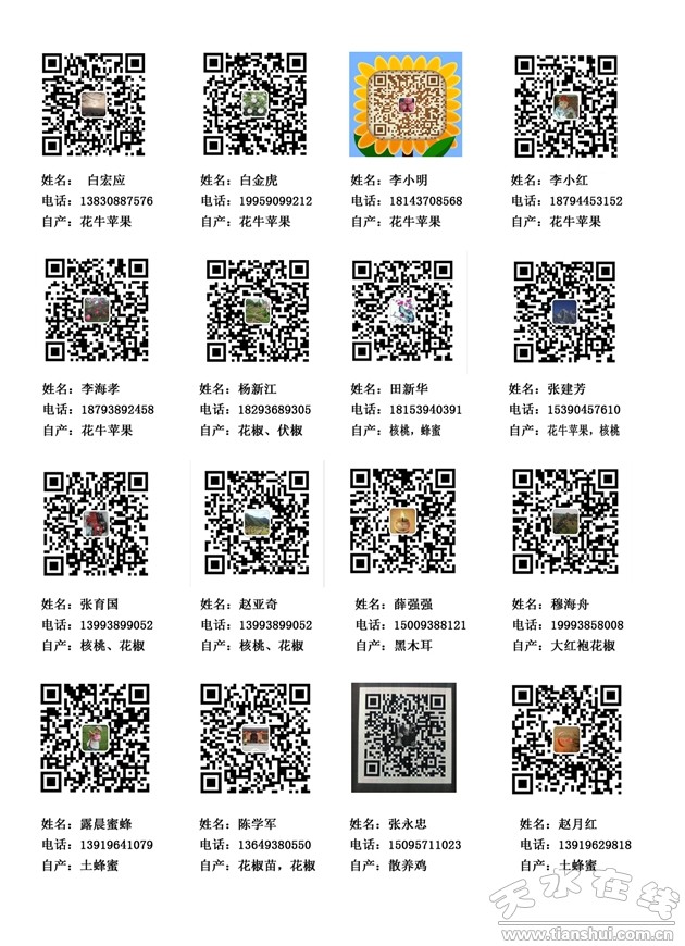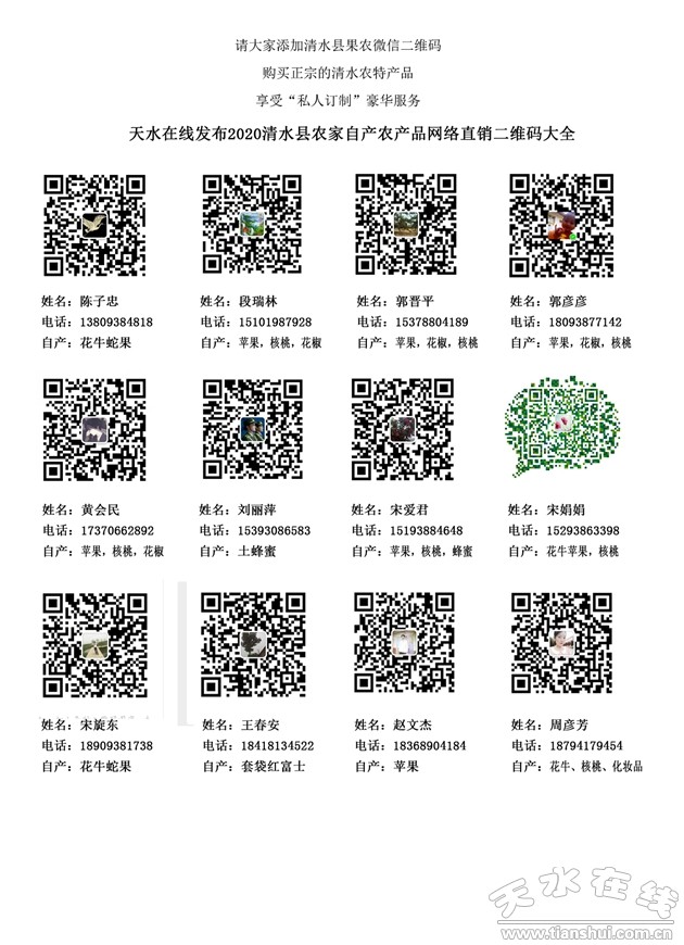 從今年年初開始,天水在線在清水縣的各個鄉(xiāng)鎮(zhèn)舉辦電子商務(wù)進(jìn)農(nóng)村綜合示范項目培訓(xùn)班活動,培訓(xùn)人員覆蓋了清水縣各個鄉(xiāng)鎮(zhèn)人員。目前正值蘋果、核桃、花椒、土蜂蜜、土雞等特色農(nóng)產(chǎn)品大量上市的季節(jié),天水在線電子商務(wù)講師從電子商務(wù)的概論、電子商務(wù)平臺、農(nóng)村電子商務(wù)和直播帶貨以及“煙鋪模式”等幾個方面,由淺入深的介紹了電子商務(wù)的基礎(chǔ)知識,幫助大家通過學(xué)習(xí)這種簡單易學(xué)的電商模式,銷售自家農(nóng)特產(chǎn)品,從而達(dá)到增收脫貧的目標(biāo)。在此,我們發(fā)布部分農(nóng)民的微信二維碼,請大家自行掃碼購買。