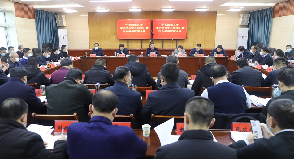 12月29日上午,清水縣委書記馬越垠主持召開縣委理論學(xué)習中心組學(xué)習暨縣四大組織聯(lián)席會,深入學(xué)習貫徹黨的十九屆六中全會及中央有關(guān)會議精神和市黨代會精神,討論《清水縣關(guān)于推動農(nóng)業(yè)產(chǎn)業(yè)高質(zhì)量發(fā)展實施意見》等11個工作方案,進一步明確全縣高質(zhì)量發(fā)展的路徑舉措,動員全縣上下牢記初心使命、堅定信心決心、發(fā)揚“鐵人精神”,確保明年工作早開展、早推進、早落實。