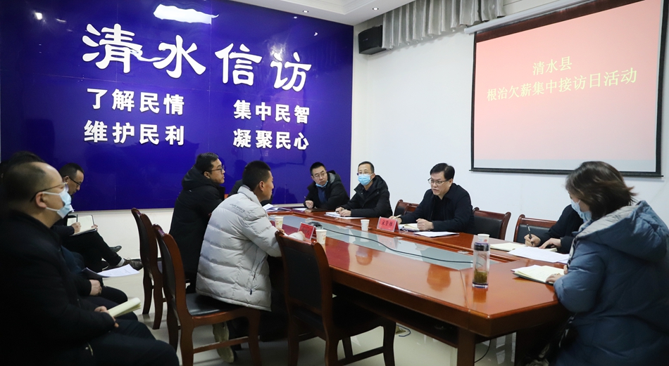 為擴(kuò)大根治欠薪冬季專項(xiàng)行動(dòng)成果,實(shí)現(xiàn)“兩個(gè)清零”的目標(biāo),確保廣大農(nóng)民工春節(jié)前能按時(shí)足額拿到工資安心過年,維護(hù)社會(huì)和諧穩(wěn)定, 1月12日,清水縣開展根治欠薪集中接訪日活動(dòng),縣委常委、常務(wù)副縣長(zhǎng)宋賢雄在縣信訪局現(xiàn)場(chǎng)接待農(nóng)民工欠薪投訴。