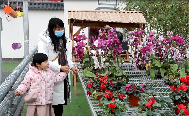 園區(qū)大廳里各色花卉爭(zhēng)芳奪艷,紅花配綠葉在寒冷的冬天顯得格外引人注目。工作人員告訴記者,這里有蝴蝶蘭、鮮開(kāi)來(lái)、紅掌、鴻運(yùn)當(dāng)頭、杜鵑、君子蘭、發(fā)財(cái)樹(shù)、幸福樹(shù)等數(shù)十種花卉植物,其中鮮開(kāi)來(lái)和蝴蝶蘭的數(shù)量最多!邦櫩推珢(ài)紅色,因?yàn)榧t色象征日子過(guò)得紅紅火火!