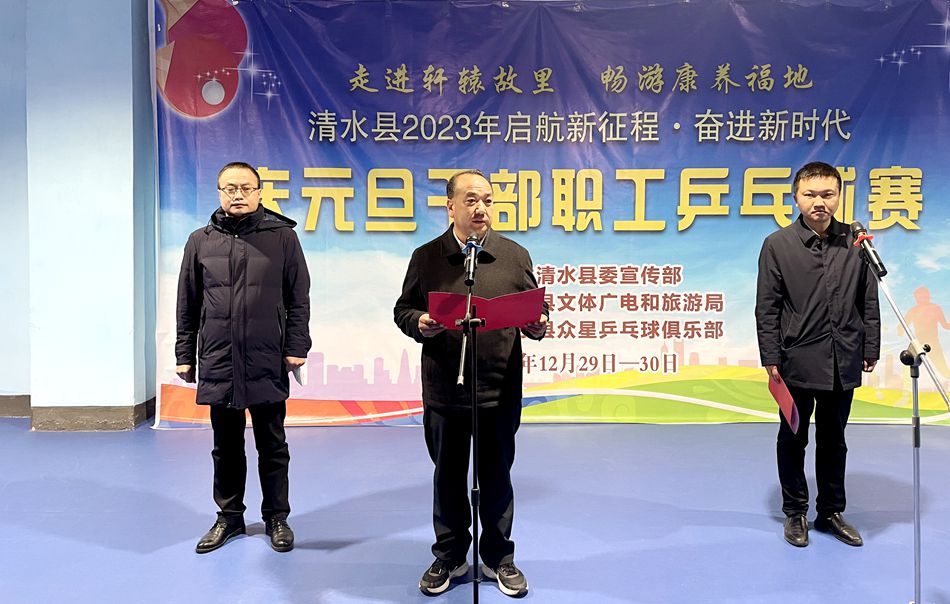 為持續(xù)推動(dòng)全民健身和群眾體育活動(dòng)健康發(fā)展,調(diào)動(dòng)廣大乒乓球愛(ài)好者參與健身運(yùn)動(dòng)的極積性,展現(xiàn)全縣干部職工樂(lè)觀向上、積極進(jìn)取的精神風(fēng)貌。在元旦、春節(jié)即將來(lái)臨之際,12月29日,清水縣舉辦 2023 年“啟航新征程·奮進(jìn)新時(shí)代”慶元旦干部職工乒乓球賽。清水縣委常委、宣傳部部長(zhǎng)馬小平參加活動(dòng)并致辭。