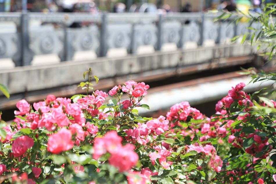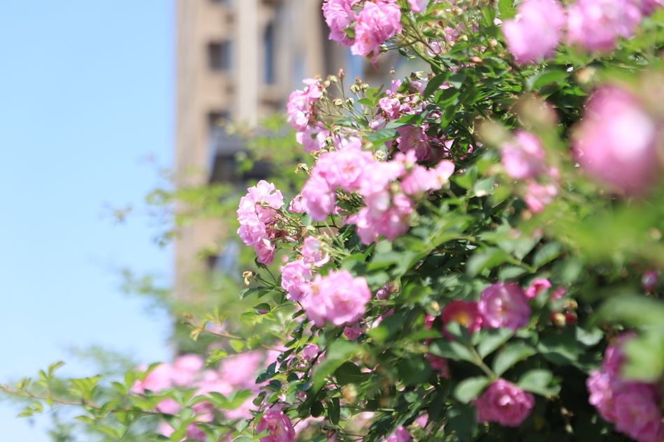 學(xué)府路上,游人如織,大片薔薇花開得熱鬧,藍(lán)天白云下,一簇簇粉色薔薇迎風(fēng)搖擺、嬌俏可人,放眼望去如一片粉色云霞,為整座城市籠上溫柔的紗。
