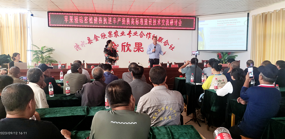 在金欣果聯(lián)合社蘋果矮砧密植建株抗逆豐產(chǎn)提質(zhì)高標(biāo)準(zhǔn)建設(shè)技術(shù)交流研討會(huì)上,托馬斯博士和瑞恩博士分別從全果園管理、果園防災(zāi)減災(zāi)設(shè)施建設(shè)、果品品牌打造、高標(biāo)準(zhǔn)示范園建設(shè)中存在的問題等方面為縣果農(nóng)進(jìn)行了培訓(xùn),同時(shí)與果農(nóng)在果樹生產(chǎn)中的難點(diǎn)以及發(fā)展方向方面進(jìn)行了現(xiàn)場交流。