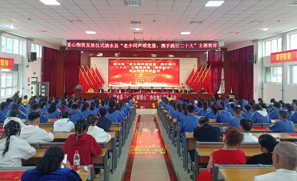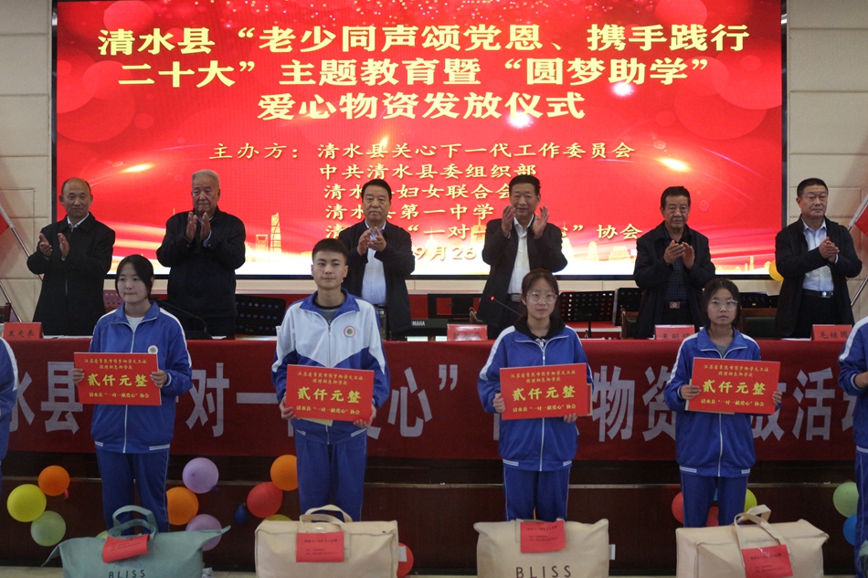 此次活動(dòng)由清水縣關(guān)工委和縣“一對(duì)一獻(xiàn)愛(ài)心”貧困兒童資助協(xié)會(huì)聯(lián)合組織,關(guān)工委“五老”同志,縣老年大學(xué),縣第一中學(xué)共同舉辦了“老少同聲頌黨恩、攜手踐行二十大”主題教育活動(dòng)。江蘇愛(ài)心人士吳國(guó)春、王永明、屈建紅,清水縣愛(ài)心人士王海虹為困難學(xué)生提供愛(ài)心資助。