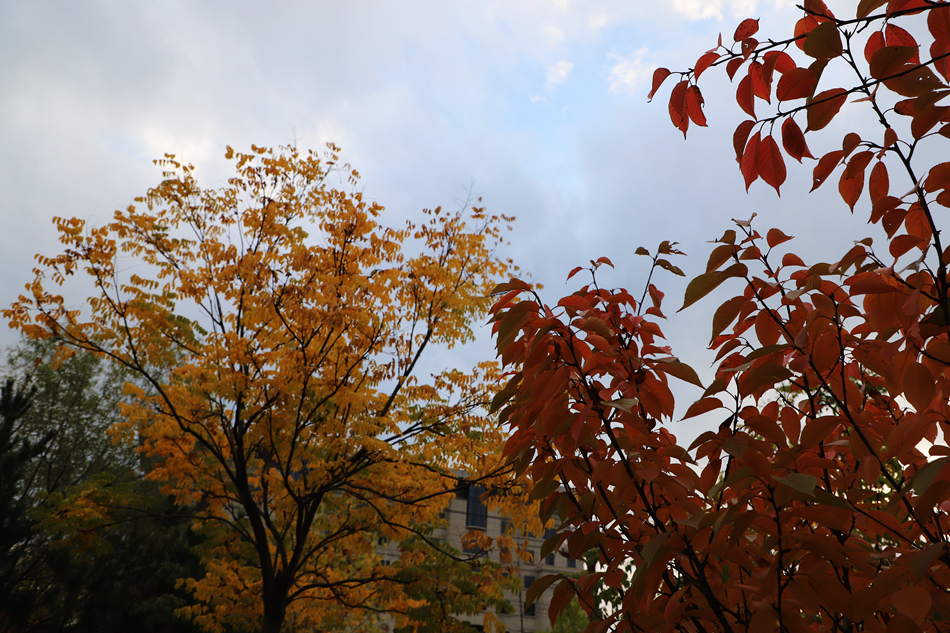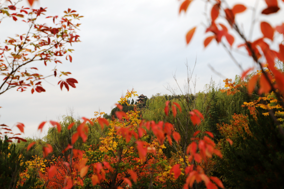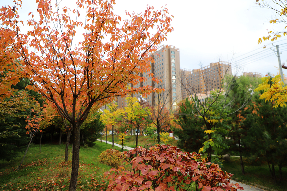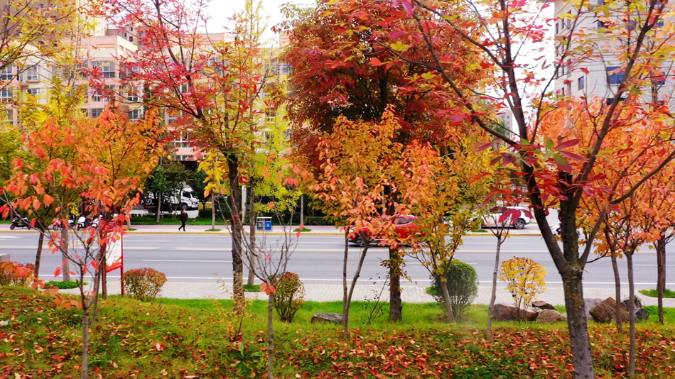 城區(qū)主干道、軒轅湖公園的銀杏、紅葉李被秋色染上最絢爛的顏色,一塊塊橙黃、一片片火紅,如巧手繪制的油畫,在藍天白云下互相映襯,斑斕鋪展,吸引游人駐足打卡、拍照留念。(攝影:趙甲偉)