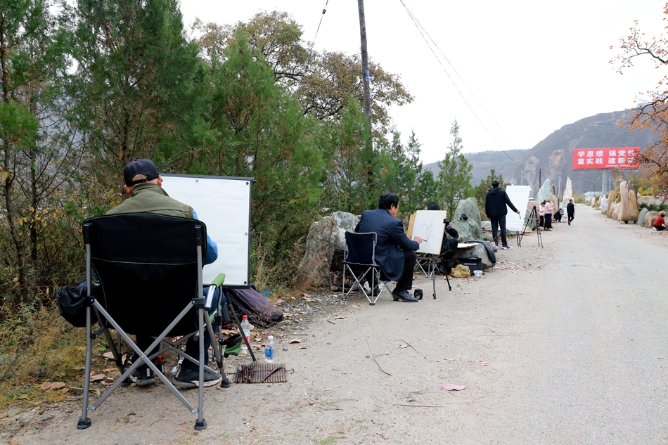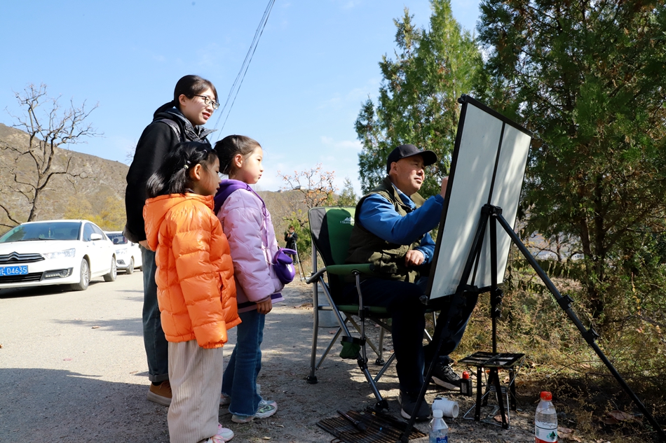 作畫現(xiàn)場,十多位畫家凝心聚神、揮毫點墨,以細(xì)膩的筆觸,將秋日美景定格紙上,引來游客駐足觀賞學(xué)習(xí)。