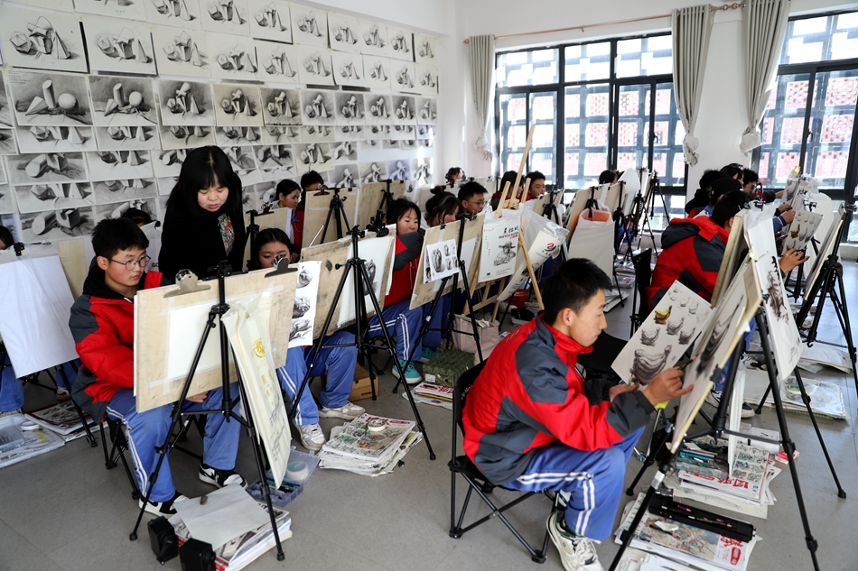 來到清水縣第八中學(xué),各個(gè)教室教學(xué)課程有序進(jìn)行,老師們教得投入,學(xué)生們學(xué)得專心。專業(yè)課教室內(nèi)美術(shù)、書法班的同學(xué)坐姿端正,一筆一畫精雕細(xì)琢,教室內(nèi)一幅幅老師和學(xué)生們創(chuàng)作的書法、繪畫作品,引人駐足欣賞。
