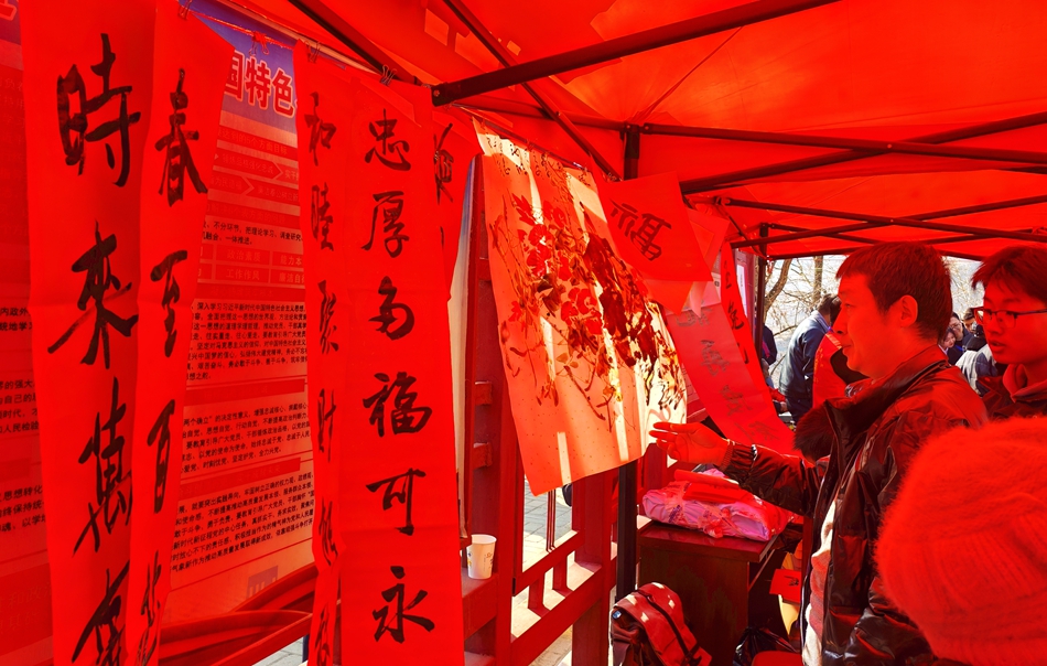 活動(dòng)現(xiàn)場,書法家們在眾人的圍觀下?lián)]毫潑墨,用一筆一墨、一撇一捺,認(rèn)真書寫承載著新春祝福的對聯(lián)和飽含真情的“!弊。“天增歲月人增壽,春滿乾坤福滿門”“龍騰盛世千家喜,春滿神州萬物榮。”不一會(huì),一副副工整雋秀、承載祝福的喜慶對聯(lián)高高懸掛,在營造歡樂祥和的節(jié)日氣氛的同時(shí),也喚起了大家對傳統(tǒng)文化的熱情,F(xiàn)場駐足欣賞的觀眾紛紛稱贊。