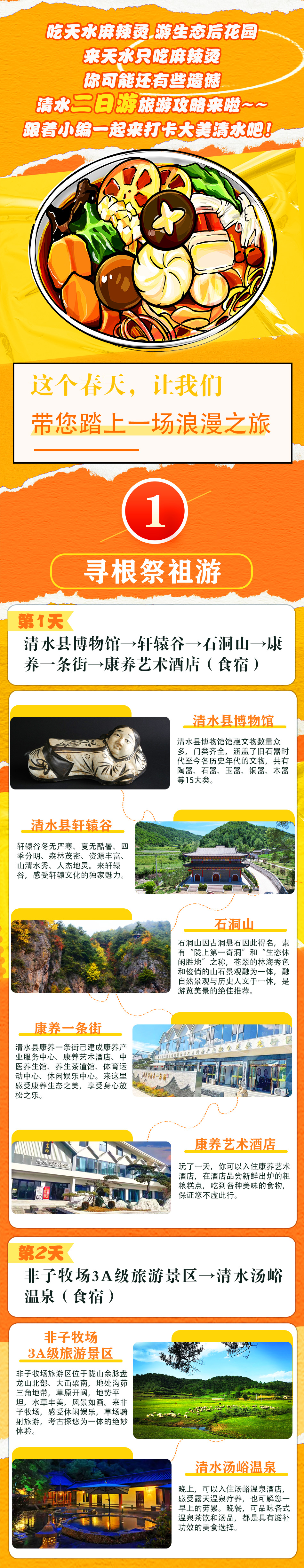 清水縣加強對車站、城市廣場、商業(yè)街區(qū)、旅游景點,特別是麻辣燙店等重點場所的環(huán)境衛(wèi)生整治,持續(xù)做好重點區(qū)域、重點街區(qū)美化亮化,以優(yōu)美環(huán)境迎接各方賓客。加快完善景區(qū)旅游信息咨詢、旅游交通標識、旅游交通設施、景區(qū)內游覽(參觀)路線及導覽圖等服務功能,強化景區(qū)內部道路和停車場建設,提升景區(qū)基礎設施條件。優(yōu)化提升“親水賞花治未病、樂我養(yǎng)我育新我”七條精品旅游線路和“一日游”“兩日游”重點旅游線路,加大旅行社“引客入清”獎補力度,鼓勵省內外旅行社和在線旅游企業(yè),開展“甘肅人游清水”“天水人游清水”等主題旅游活動,讓游客引得來、留得住。推廣清水縣縣城夜游觀光,充分利用旅游景點、軒轅湖、全民健身公園等資源,結合運用軒轅湖夜景亮化、音樂噴泉、水幕電影等現(xiàn)代元素,打造夜間“打卡”景點。