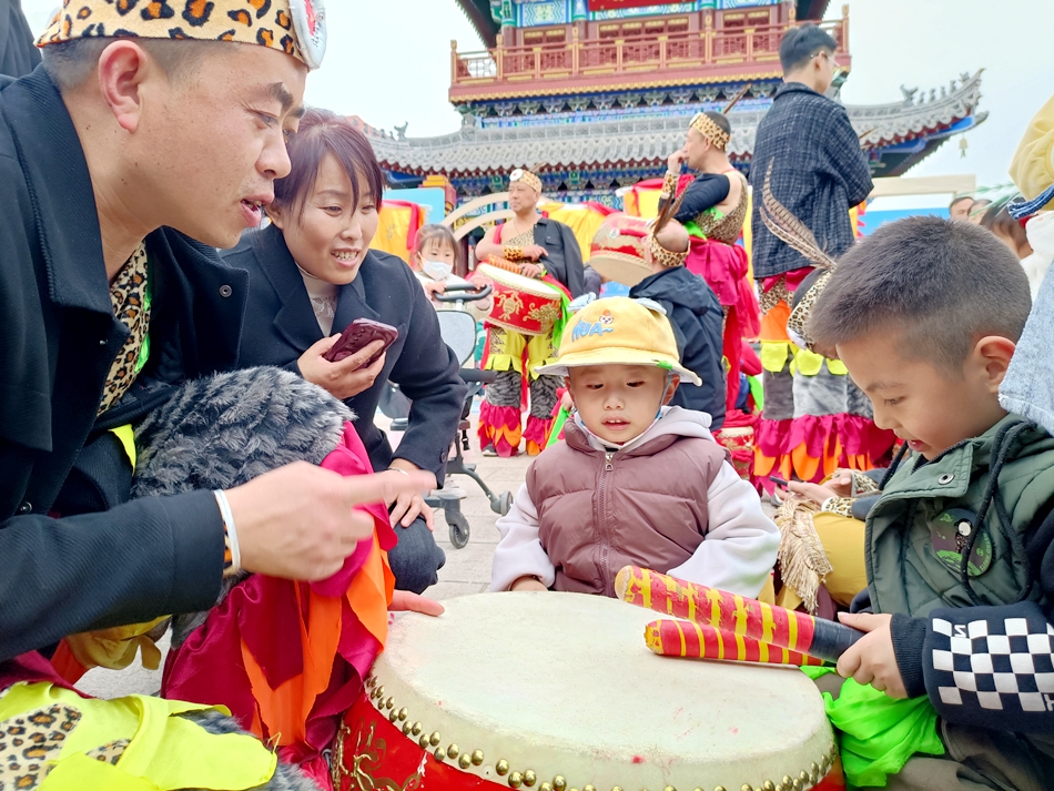 有“天下第一鼓”美譽的軒轅鼓是今日的“明星”,往來游客在觀賞鼓舞后紛紛湊到鼓前嘗試敲擊,鼓手們也笑著向游客們講解敲鼓的方法,場面一時其樂融融、分外溫馨。