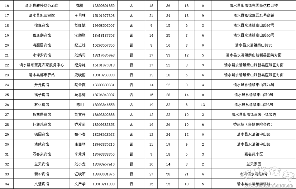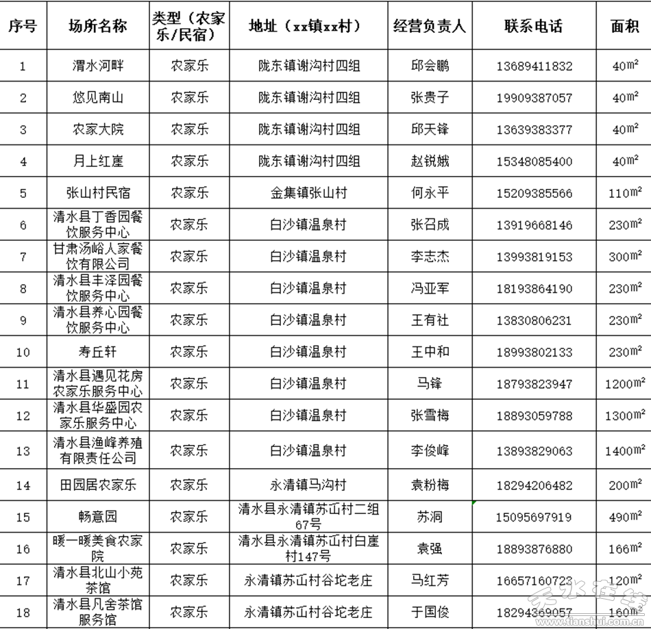 清水縣民宿、農(nóng)家樂住宿信息一覽表