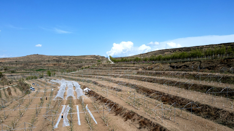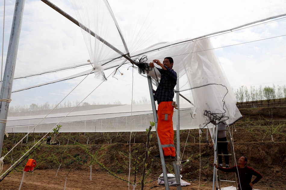 防雹網(wǎng)是抵御冰雹、大風(fēng)等極端天氣最直接有效的措施。郭川鎮(zhèn)素有“蘋果之鄉(xiāng)”美譽(yù),果園面積達(dá)到3400余畝,每年的冰雹等自然災(zāi)害成為果農(nóng)的一塊“心病”,近年來(lái),依托防災(zāi)減災(zāi)扶持政策,防雹網(wǎng)搭建成為每年備春耕生產(chǎn)必要工作之一。