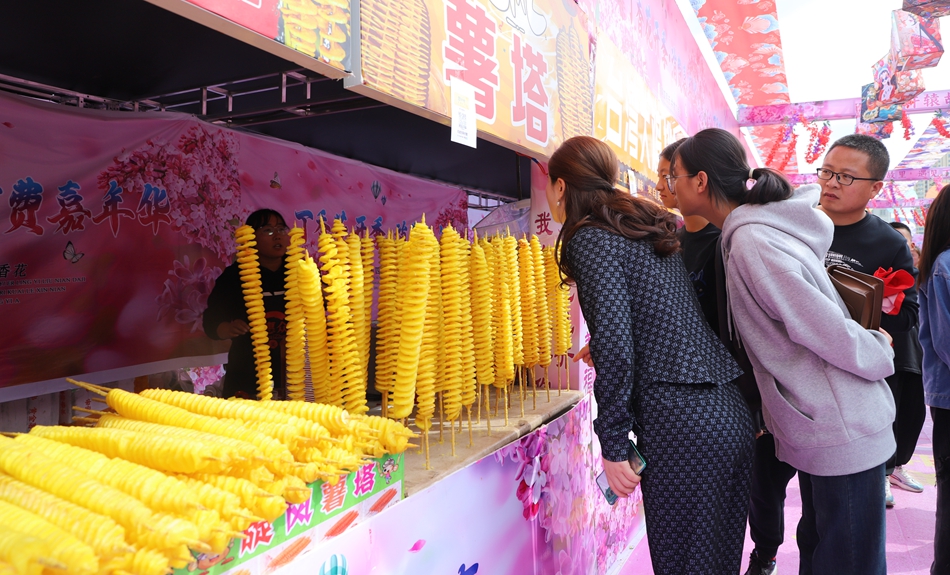 外地美食臺灣旋風(fēng)薯塔,新疆烤肉,花樣繁多的蛋糕、薯條、薯片、烤面筋更是吸引不少游客和市民紛紛品嘗、選購,現(xiàn)場人氣火爆。
