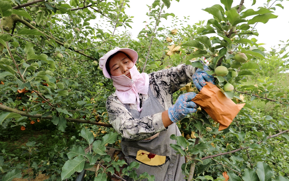 眼下正是蘋果套袋的最佳時(shí)期,果農(nóng)們正搶抓農(nóng)時(shí),給幼果套袋。撐袋、套果、扎口,果農(nóng)們動(dòng)作嫻熟、一氣呵成,不一會(huì)兒整棵果樹的幼果都穿上了“金罩衣”。