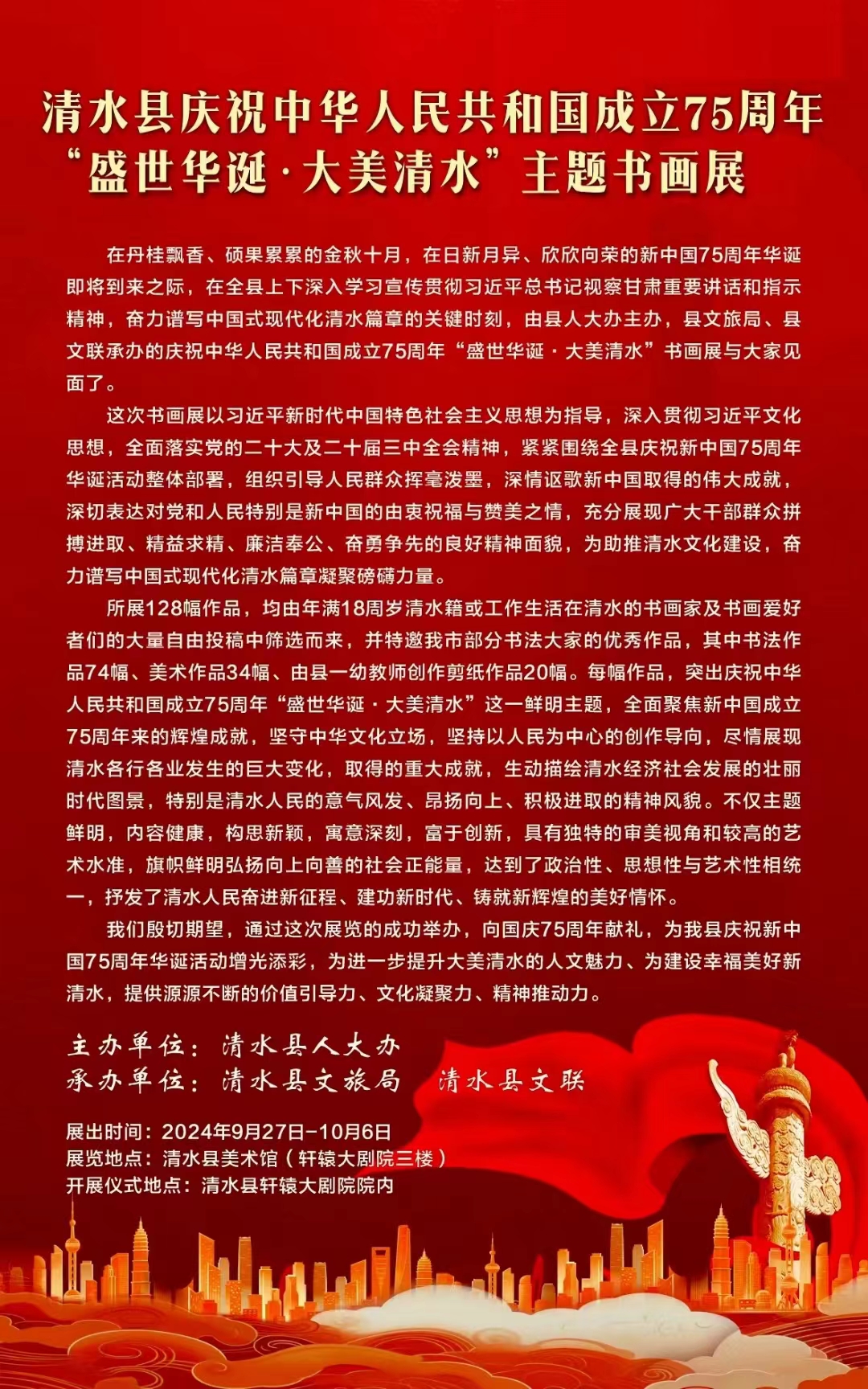 清水縣慶祝中華人民共和國(guó)成立75周年“盛世華誕·大美清水”主題書(shū)畫(huà)展即將開(kāi)展