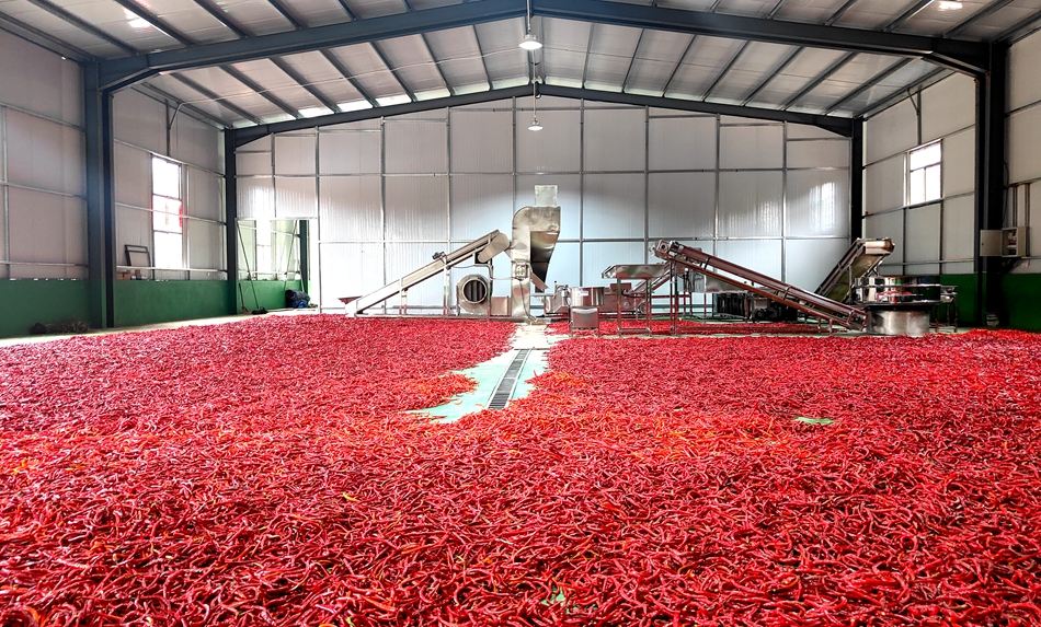 來到草川鋪鎮(zhèn)分水嶺辣椒車間,濃郁的椒香味瞬間撲面而來,正在晾曬的鮮紅辣椒鋪滿了整個(gè)加工車間,火紅一片,十分壯觀。與此同時(shí),另一個(gè)車間里,工人正忙著將打包完成的新鮮辣椒搬運(yùn)至傳送帶上,伴隨著隆隆的機(jī)器轟鳴聲,不到半分鐘,一袋辣椒就從車間被送到了貨車上。