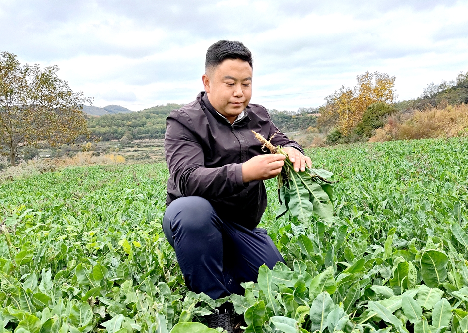 在興坪村款冬花種植基地里,清水縣杏林藥材種植農(nóng)民專業(yè)合作社負(fù)責(zé)人李國(guó)平正在藥材地里察看款冬花的長(zhǎng)勢(shì),他雙手掀開款冬葉子,紫色的款冬花蕾清晰可見,簇?fù)碓谒幉母浚壳叭栽谏L(zhǎng)期,立冬后便能迎來(lái)豐收。
