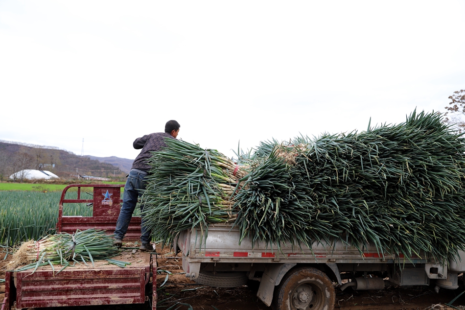 11月18日,記者來到溫溝村的大蔥種植田,伴隨著大蔥自動(dòng)收割機(jī)的轟鳴聲,一排排蔥白瑩潤、粗細(xì)均勻的大蔥連根拔起,現(xiàn)場10余名村民熟練有序地收蔥、捆扎、搬運(yùn)、裝車,田間地頭一派好“豐”景。