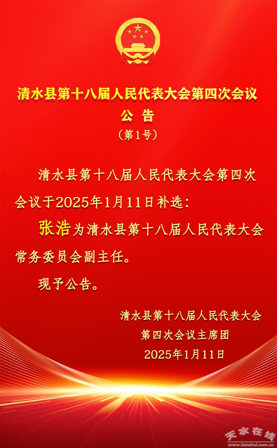 清水縣第十八屆人民代表大會第四次會議公告(第1號)