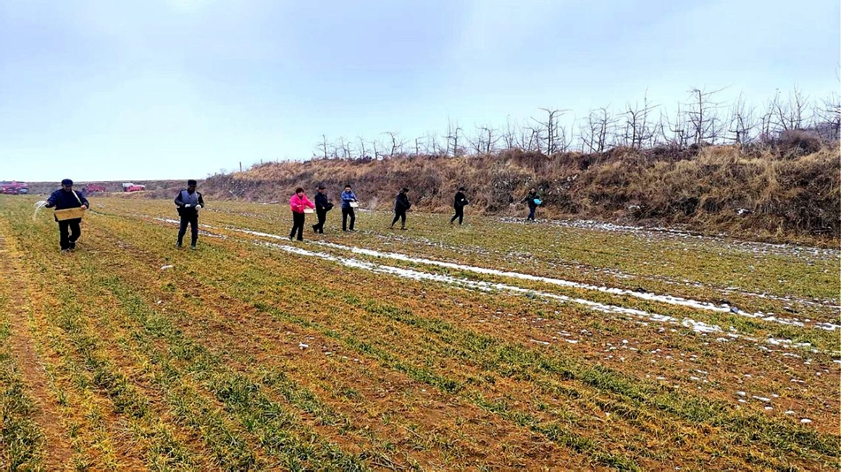 在金集鎮(zhèn)馬列灣良種小麥示范基地里,農(nóng)業(yè)技術人員正在為村民講解小麥追肥的用量、比例和次數(shù)等田間管理知識。農(nóng)田里,肥料整齊放在地頭,農(nóng)戶們在田間穿梭進行施肥,田間地頭一派繁忙景象。