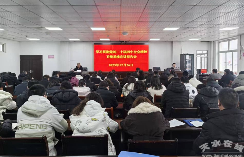 為深入學習貫徹黨的二十屆四中全會精神,切實把全系統(tǒng)思想和行動統(tǒng)一到黨中央決策部署上來,12月26日,清水縣衛(wèi)生健康系統(tǒng)舉行黨的二十屆四中全會精神專題宣講會?h人民醫(yī)院、縣中醫(yī)醫(yī)院、疾病預防控制中心、婦幼保健院4個縣直醫(yī)療機構黨支部書記、黨員及群眾代表,永清社區(qū)衛(wèi)生服務中心負責人,以及20個鄉(xiāng)鎮(zhèn)衛(wèi)生院、分院院長及黨員代表齊聚一堂,共同領悟全會關于“加快建設健康中國”的重大戰(zhàn)略部署,凝聚衛(wèi)健事業(yè)高質量發(fā)展的奮進力量。