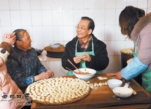 1月22日,溫家寶來到環(huán)縣環(huán)城鎮(zhèn)十八里村,看望村民,并和他們一起包餃子。本報(bào)記者 高檣