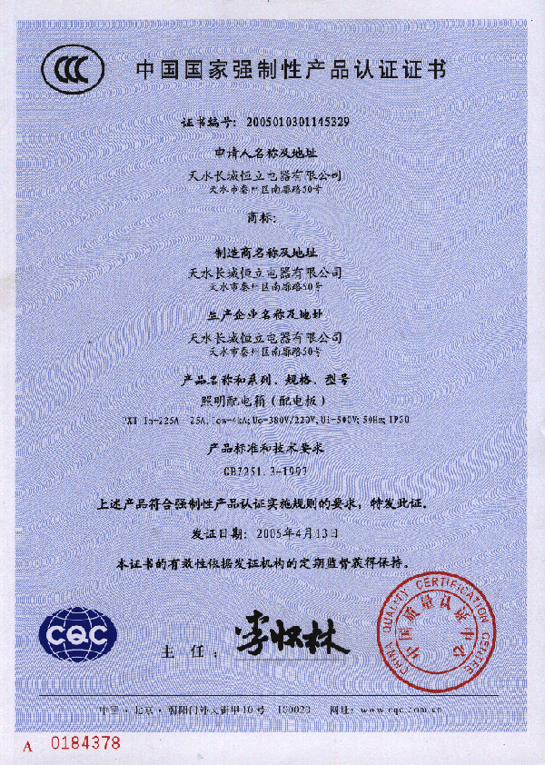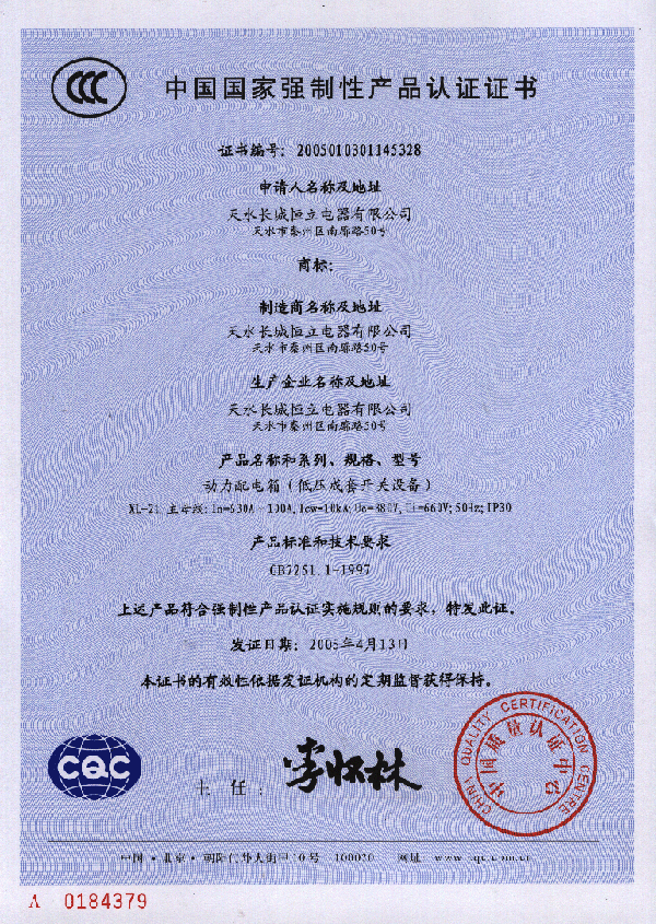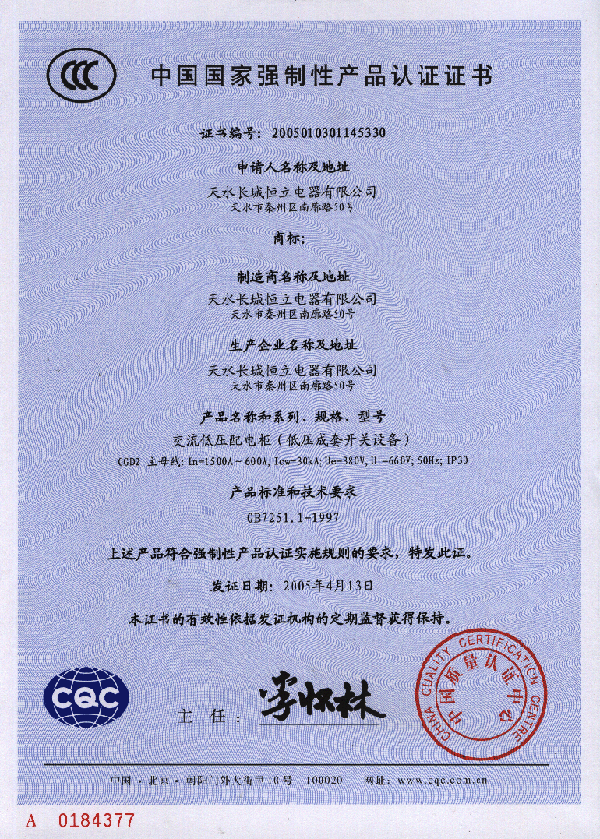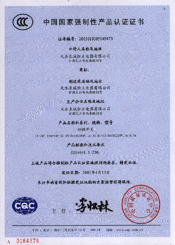 天水長城恒立電器有限公司獲得ISO9001:2000認證及產(chǎn)品3C認證