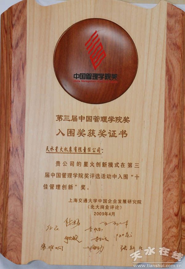 由上海交通大學中國企業(yè)發(fā)展研究院、《北大商業(yè)評論》雜志社聯(lián)合主辦,《第一財經(jīng)日報》、搜狐網(wǎng)站提供合作支持的第三屆“中國管理學院獎”日前在上海交通大學舉行頒獎典禮,天水星火機床有限責任公司入圍“中國管理學院獎”。