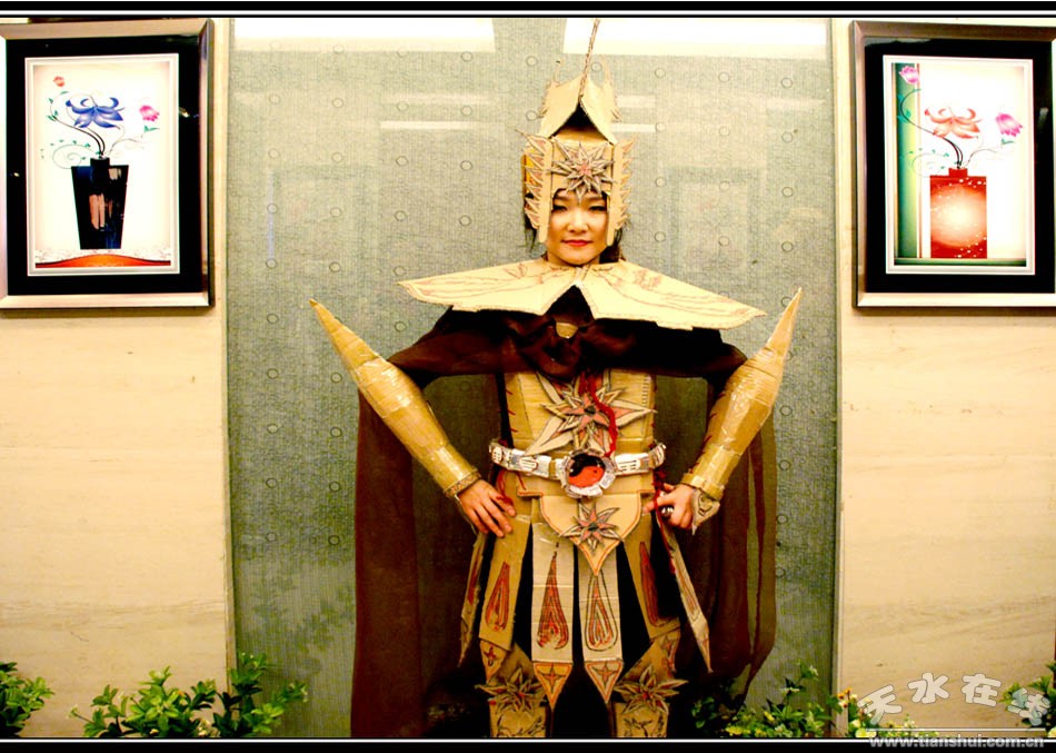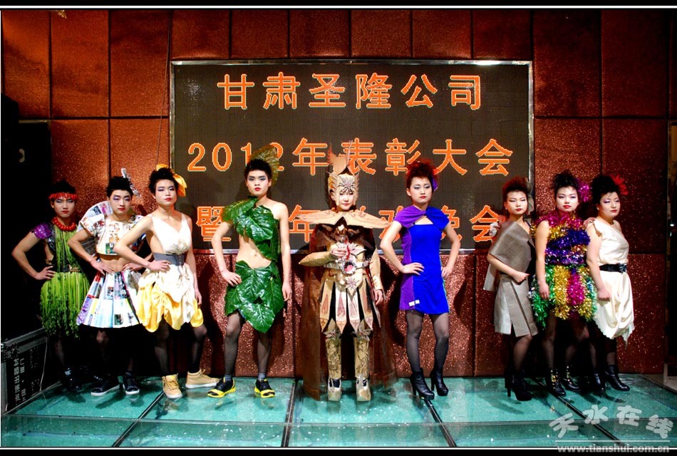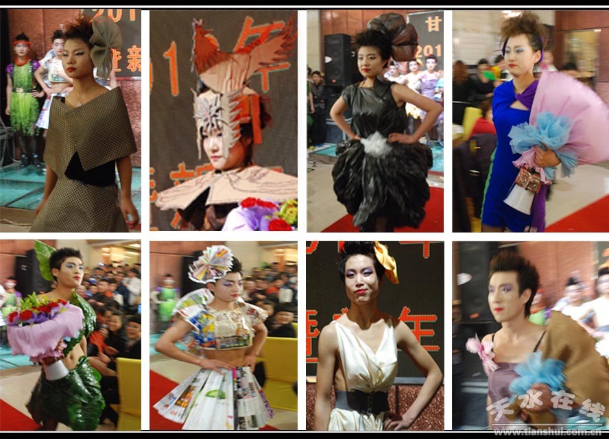 (公司員工用蔬菜、餐巾、包裝箱等用品制作成的時(shí)裝走秀)