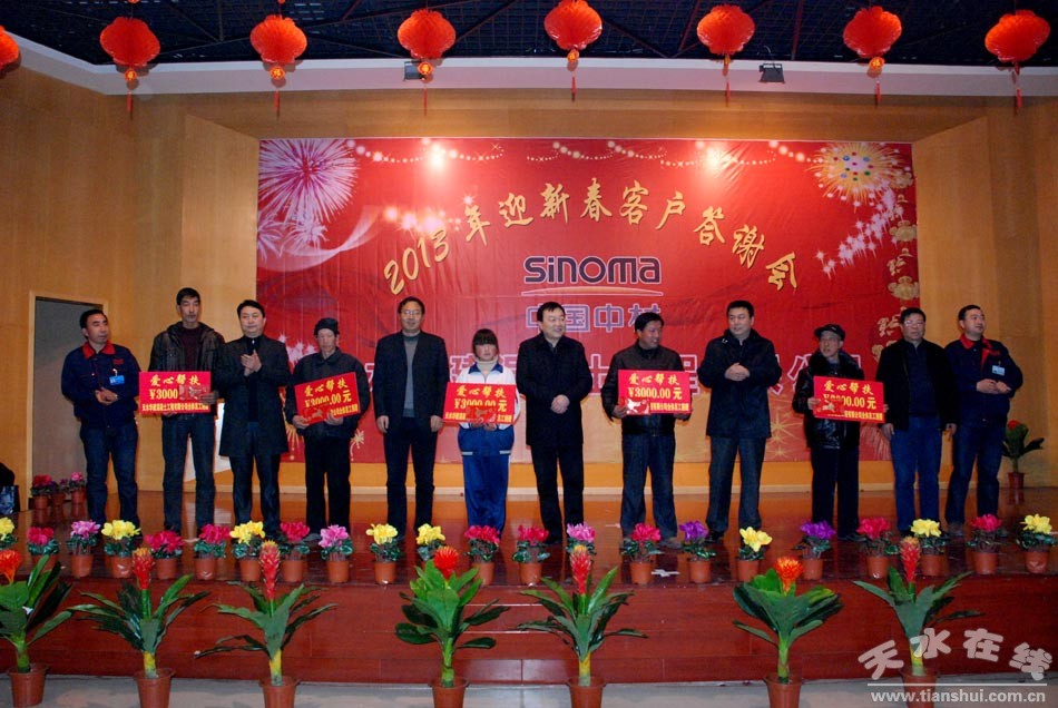 1月11日,天水華建混凝土工程有限公司舉行2013年迎新春客戶答謝會。天水華建混凝土工程有限公司緱海榮總經(jīng)理致答謝詞,天水中材水泥有限責(zé)任公司總經(jīng)理金敏致祝酒詞;天水永生房地產(chǎn)開發(fā)公司副總經(jīng)理范金龍、甘肅盛達(dá)集團(tuán)副總裁頡光照、天水宏達(dá)建筑有限公司董事長楊侑倉、天水星光房地產(chǎn)開發(fā)公司董事長王林等作為客戶代表發(fā)言。