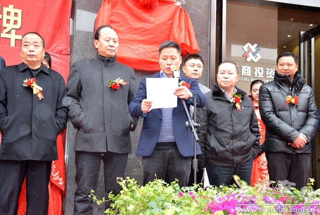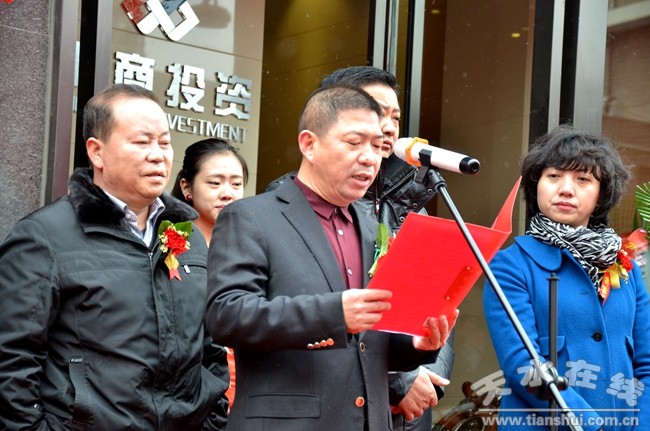 開業(yè)儀式上,天水浙商投資公司董事長方正偉,天水浙江商會會長、甘肅圣隆裝飾有限公司董事長章圣架先生,天水市工商聯(lián)主席鞏玉保先生先后發(fā)表熱情洋溢的講話。天水市委統(tǒng)戰(zhàn)部、市工商聯(lián)有關領導以及金融界、浙江企業(yè)家聯(lián)合會企業(yè)老總、社會各界嘉賓近200人參加了當天開業(yè)儀式。