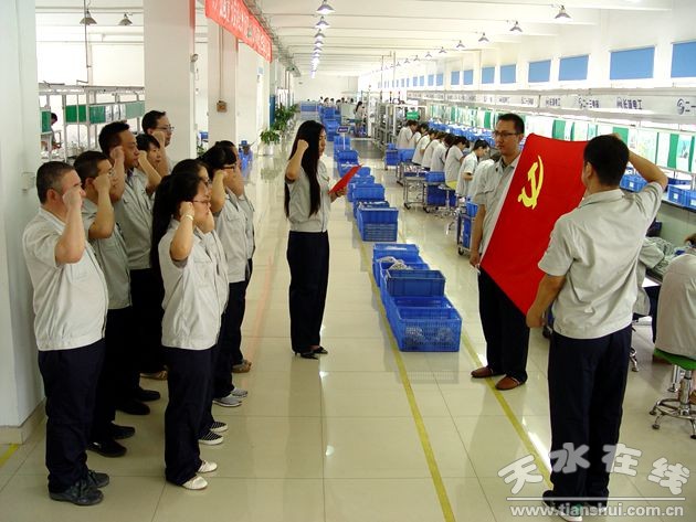 七一黨日活動(dòng)當(dāng)天早上八點(diǎn),天水二一三電器有限公司天水總部200多名黨員參加了由公司黨委開展的以“升國(guó)旗暨宣誓活動(dòng)”為主要內(nèi)容的黨日活動(dòng);顒(dòng)現(xiàn)場(chǎng),在嘹亮的國(guó)歌聲中,鮮艷的五星紅旗冉冉升起,全體黨員向國(guó)旗行注目禮,共同祝愿?jìng)ゴ蟮淖鎳?guó)更加繁榮昌盛。在新黨員宣誓、老黨員重溫入黨誓詞活動(dòng)中,全體黨員莊嚴(yán)的舉起右手,在鮮紅的黨旗面前鏗鏘有力的宣誓,表達(dá)對(duì)黨的無限忠誠(chéng)和崇高敬意。同時(shí),該公司駐外的開發(fā)區(qū)黨支部、上海公司黨支部、西安公司黨支部也按公司黨委統(tǒng)一安排部署,舉行了莊嚴(yán)的宣誓活動(dòng)。