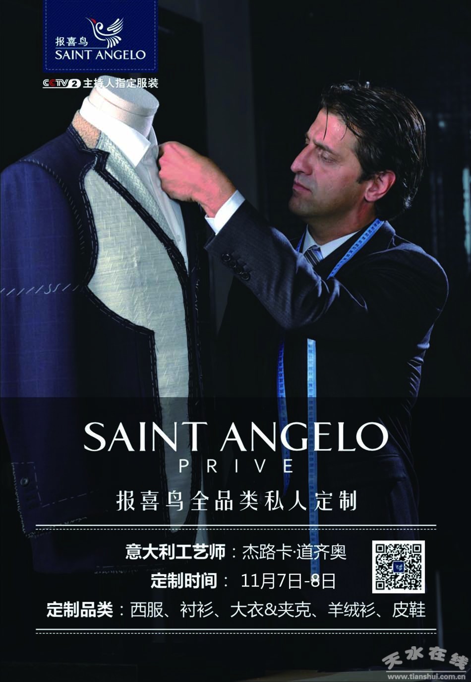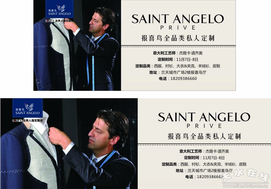 報(bào)喜鳥(niǎo),以寵愛(ài)男人之名,締造高貴、儒雅、精致格調(diào),全品類,個(gè)性化,奢華尊享“自我價(jià)值”著裝時(shí),2015年11月7日-8日,天水蘭天城市廣場(chǎng)2樓報(bào)喜鳥(niǎo)廳攜手意大利量體工藝師杰路卡•道齊奧,為天水紳士奉上一道定制盛宴,量體打造專屬的尊貴個(gè)性,敬請(qǐng)期待!
