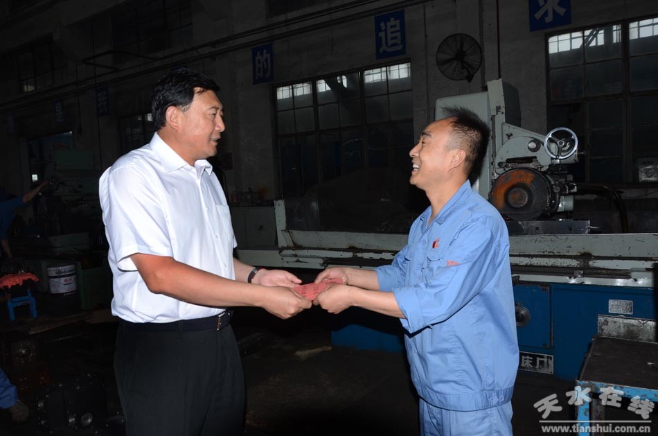 天水鍛壓在家領(lǐng)導(dǎo)董事長吳輝,副總經(jīng)理咎躍杰,總工程師王東明,總經(jīng)理助理戈旭東、楊軍及其黨委辦工作人員和第一聯(lián)合分廠黨支部負(fù)責(zé)人隨同參加了慰問。