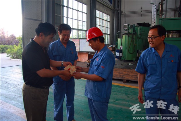 天水鍛壓集團(tuán)集團(tuán)公司黨委書記副總經(jīng)理孫宏,黨委委員副總經(jīng)理昝躍杰,紀(jì)委書記工會(huì)主席兼黨委辦公室主任白峰及其黨委辦工作人員,第二聯(lián)合分廠黨支部書記兼廠長王擁軍陪同進(jìn)行了慰問。