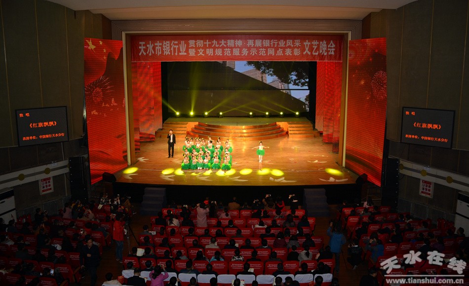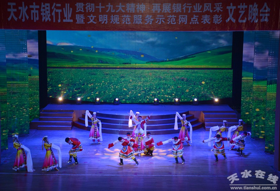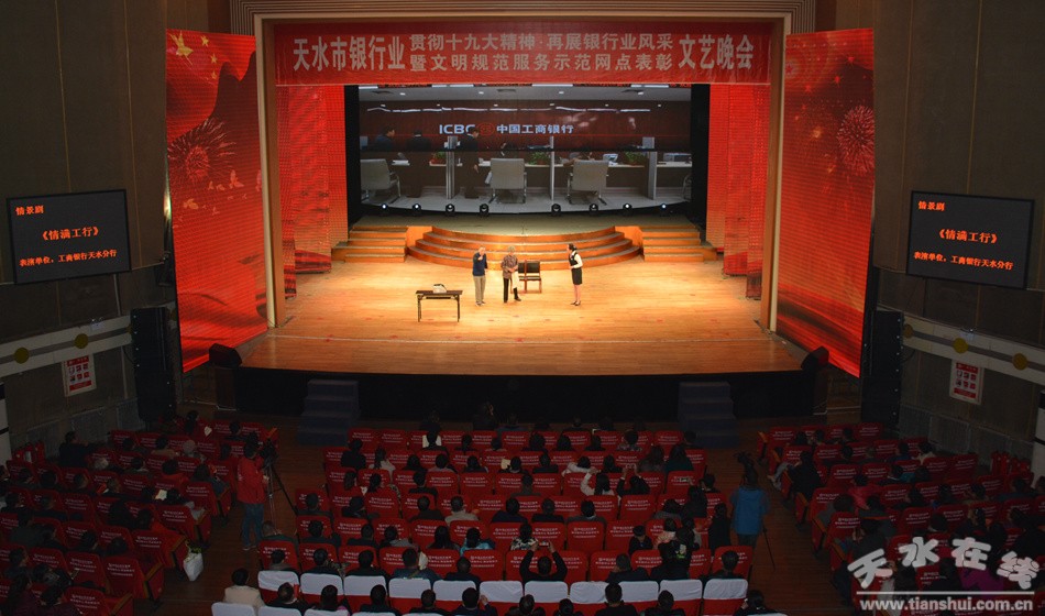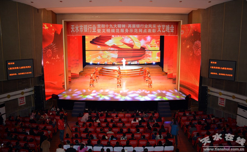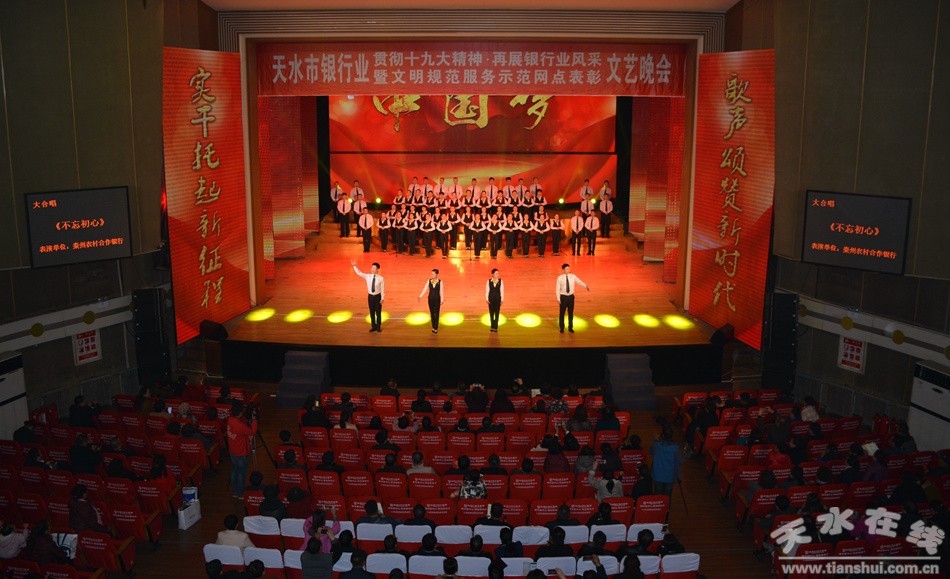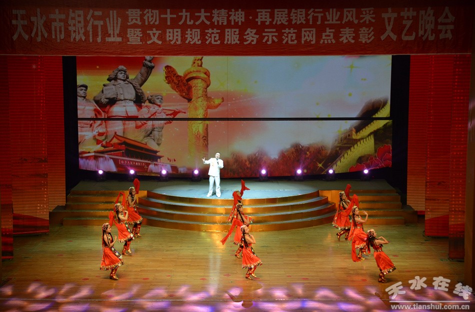 11月13日晚,由天水市銀行業(yè)協(xié)會(huì)主辦的“貫徹十九大精神 再展銀行業(yè)風(fēng)采”暨文明規(guī)范服務(wù)示范網(wǎng)點(diǎn)表彰文藝晚會(huì)在秦州大劇院舉辦。晚會(huì)上表彰了18家由市文明辦、市銀協(xié)評(píng)選出的示范網(wǎng)點(diǎn),市銀協(xié)會(huì)員單位表演了大合唱、歌伴舞、舞蹈、情景劇《歌唱祖國(guó)》、《不忘初心》、《盛世花開》等19個(gè)精彩的文藝節(jié)目。副市長(zhǎng)程偉東出席晚會(huì)并頒獎(jiǎng)。