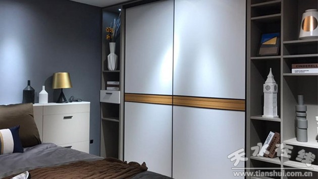 衣柜+書柜+書桌的多功能一體化設(shè)計在臥室里分隔出休息區(qū)和學(xué)習(xí)區(qū),設(shè)計強(qiáng)調(diào)簡單結(jié)構(gòu)與舒適功能的完美結(jié)合。移門使用聯(lián)邦高登新款洛可卡其腰線,花紋精巧別致,契合了人們追求生活品質(zhì),彰顯時尚生活方式的心理需求。