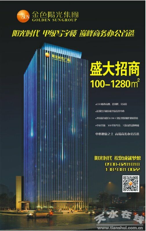 陽(yáng)光時(shí)代不僅僅只擁有超越甲級(jí)寫(xiě)字樓的硬件設(shè)施,更擁有無(wú)可比擬的軟實(shí)力作為支撐。天水金色陽(yáng)光集團(tuán)集20多年地產(chǎn)開(kāi)發(fā)經(jīng)驗(yàn),廣泛涉足房地產(chǎn)開(kāi)發(fā)、旅游飯店、文化產(chǎn)業(yè)、金融服務(wù)、物業(yè)經(jīng)營(yíng)管理等多個(gè)領(lǐng)域。我們誠(chéng)邀各界精英入駐陽(yáng)光時(shí)代廣場(chǎng),與您共創(chuàng)輝煌。