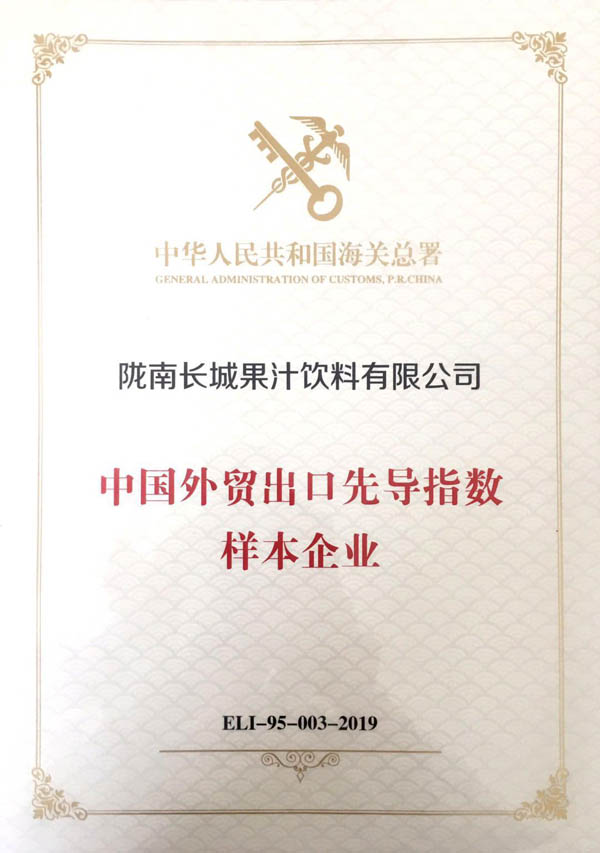 5月24日,在蘭州海關(guān)主辦的“中國(guó)外貿(mào)出口先導(dǎo)指數(shù)樣本企業(yè)”宣講會(huì)授牌儀式上,天水長(zhǎng)城果汁集團(tuán)隴南長(zhǎng)城果汁飲料有限公司榮膺“中國(guó)外貿(mào)出口先導(dǎo)指數(shù)樣本企業(yè)”。在此次樣本企業(yè)輪換中,甘肅省僅有3家企業(yè)入選,這也是自海關(guān)總署編制發(fā)布該指數(shù)以來(lái),天水長(zhǎng)城果汁集團(tuán)首次入選該指數(shù)“樣本企業(yè)”。