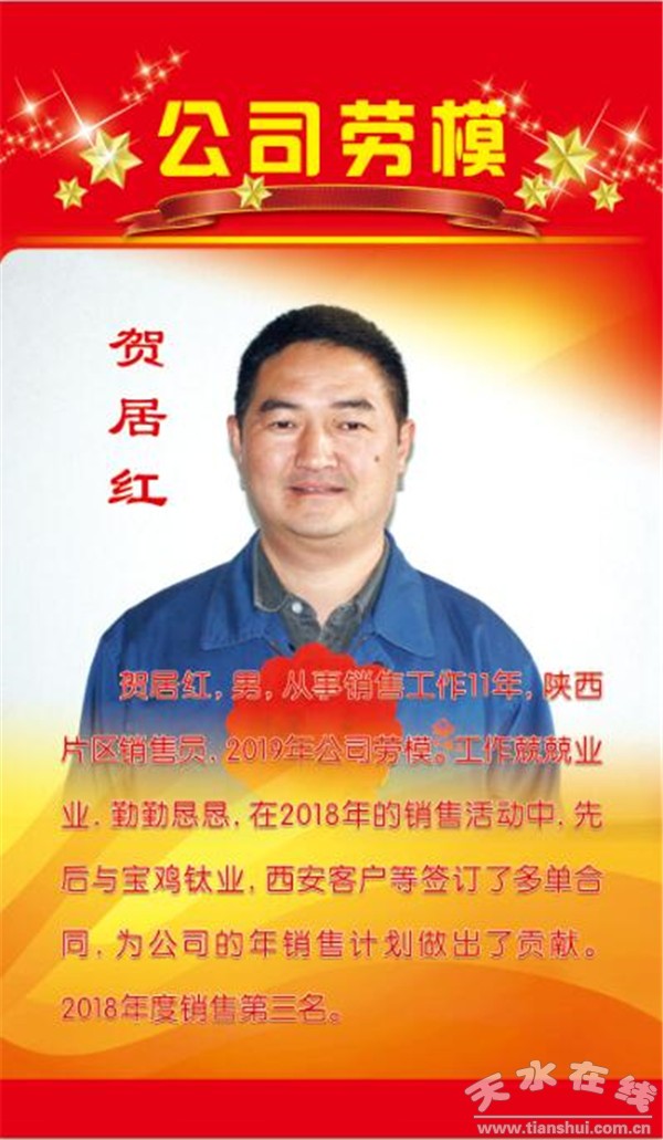 2007年賀居紅同志積極響應(yīng)公司招聘銷售員的號召,報名參加了銷售員的競選活動,在多名參加考試的職工中脫穎而出,選拔成了公司的一名合格銷售員,先后在蘭州、西安等地工作。工作期間他處處為公司利益著想,兢兢業(yè)業(yè),勤勤懇懇,雖沒做出太多驚天動地的大事,卻在自己的崗位上盡職盡責,沒有辜負公司對他多年培養(yǎng),在奉獻中找到了自己的人生價值。他用自己辛勤的汗水和智慧,塑造了天水鍛壓銷售人員的形象,在銷售業(yè)績中起到了表率作用,得到了公司領(lǐng)導和同事們的一致認可。