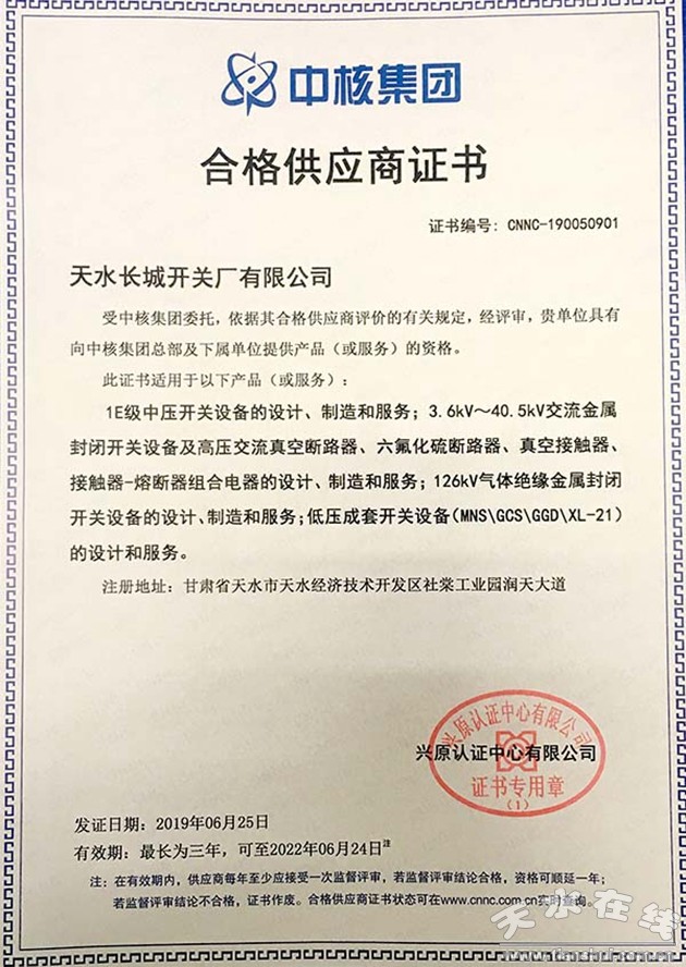 近日,長城電工天水長城開關(guān)廠有限公司順利通過中核集團(tuán)合格供應(yīng)商資格審查,取得中核集團(tuán)合格供應(yīng)商資格。