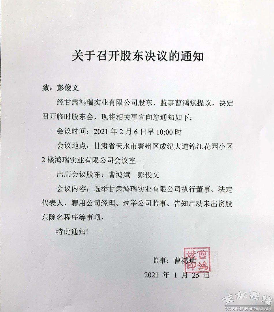 經(jīng)甘肅鴻瑞實業(yè)有限公司股東、監(jiān)事曹鴻斌提議,決定召開臨時股東會,現(xiàn)將相關(guān)事宜向您通知如下: