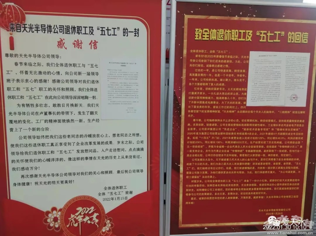天水天光半導(dǎo)體有限責(zé)任公司遵循為企業(yè)謀發(fā)展,為員工謀福利的遵旨,2021年生產(chǎn)經(jīng)營(yíng)實(shí)現(xiàn)逆勢(shì)上揚(yáng),企業(yè)通過“揭榜掛帥”制度營(yíng)造全員創(chuàng)新氛圍,實(shí)現(xiàn)新品開發(fā)和工藝公關(guān)新突破,同時(shí)企業(yè)積極做好員工關(guān)懷,尤其通過對(duì)退休員工開展慰問,彰顯責(zé)任擔(dān)當(dāng),為企業(yè)文化建設(shè)凝聚發(fā)展力量。