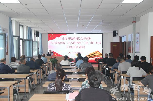 為深入學(xué)習(xí)貫徹黨的二十大精神,有序推進“三抓三促”行動,引導(dǎo)黨員干部深刻領(lǐng)會和準(zhǔn)確把握黨的二十大精神的豐富內(nèi)涵和精神實質(zhì),6月16日,甘肅煤田地質(zhì)局綜合普查隊舉辦了黨的二十大精神暨“三抓三促”行動專題輔導(dǎo)講座。此次講座邀請?zhí)焖形v師團成員、市委黨校黨史與黨建教研部副主任侯強強作專題輔導(dǎo)。普查隊在隊班子成員、中層干部、全體在職黨員和入黨積極分子參加。講座由該隊黨委副書記、紀(jì)委書記張永旭主持。