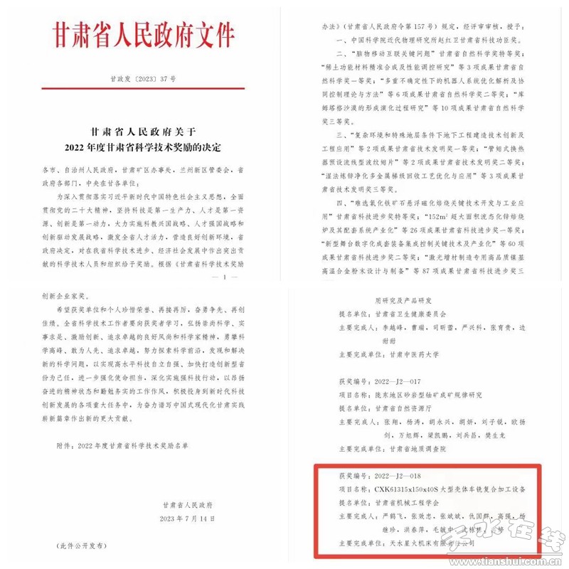 日前,甘肅省人民政府對(duì)在我省科學(xué)技術(shù)進(jìn)步、經(jīng)濟(jì)社會(huì)發(fā)展中作出突出貢獻(xiàn)的科學(xué)技術(shù)人員和組織進(jìn)行了評(píng)審獎(jiǎng)勵(lì)。由星火機(jī)床集團(tuán)公司機(jī)床研究院科研人員嚴(yán)鶴飛、張效忠、張斌斌、仇國(guó)群、高強(qiáng)、楊繼珍、洪春萍、毛毓中、沈棟棟、冉婷研發(fā)的CXK61315x150x40S大型殼體車銑復(fù)合加工設(shè)備榮獲甘肅省科學(xué)技術(shù)進(jìn)步獎(jiǎng)二等獎(jiǎng)。