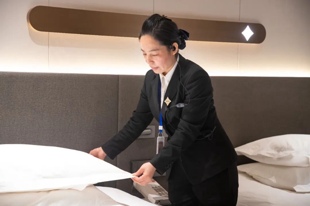 作為客房部的“領(lǐng)頭雁”,張妍始終以身作則、率先垂范。客房清潔工作繁雜瑣碎,既要保證速度,又要保證質(zhì)量,遇到旅游旺季或大型接待任務(wù)時(shí),工作量更是翻倍,但無(wú)論任務(wù)多么繁重,張妍從不叫苦叫累,總是沖在最前面。每天清晨,她總是第一個(gè)到崗,仔細(xì)檢查前一天的工作記錄,規(guī)劃當(dāng)天的清潔任務(wù);傍晚時(shí)分,她又是最后一個(gè)下班,逐一巡查每間客房的衛(wèi)生狀況、設(shè)施設(shè)備運(yùn)行情況,確保每一間交到前臺(tái)售賣的房間都整潔干凈、無(wú)可挑剔。從大廳到走廊,從客房到衛(wèi)生間,從后院停車場(chǎng)到各類公共區(qū)域,酒店的每個(gè)角落都留下了她忙碌的身影。她對(duì)衛(wèi)生標(biāo)準(zhǔn)的要求近乎“苛刻”,墻角的積塵、窗戶的污漬、家具的縫隙,只要是她發(fā)現(xiàn)的問題,都會(huì)立即整改。有員工不解地問她:“張經(jīng)理,差不多就行了,沒必要這么較真吧?”她總是笑著回答:“賓客選擇我們酒店,就是信任我們,我們必須用最優(yōu)質(zhì)的服務(wù)回報(bào)這份信任,細(xì)節(jié)決定成敗,任何小問題都不能忽視!