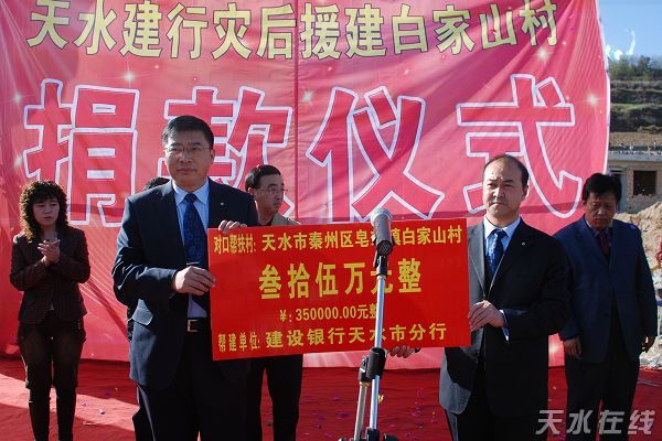 地震發(fā)生后,按照天水市委、市政府的統(tǒng)一安排,天水市建行對口幫扶白家山村災后重建工作,市建行領導高度重視,多次深入白家山村視察災情,指導抗震救災和災后重建工作,給予了大力支持,這次捐助的35萬元,主要用于80戶災后重建群眾的“一池三改”等配套基礎設施建設。